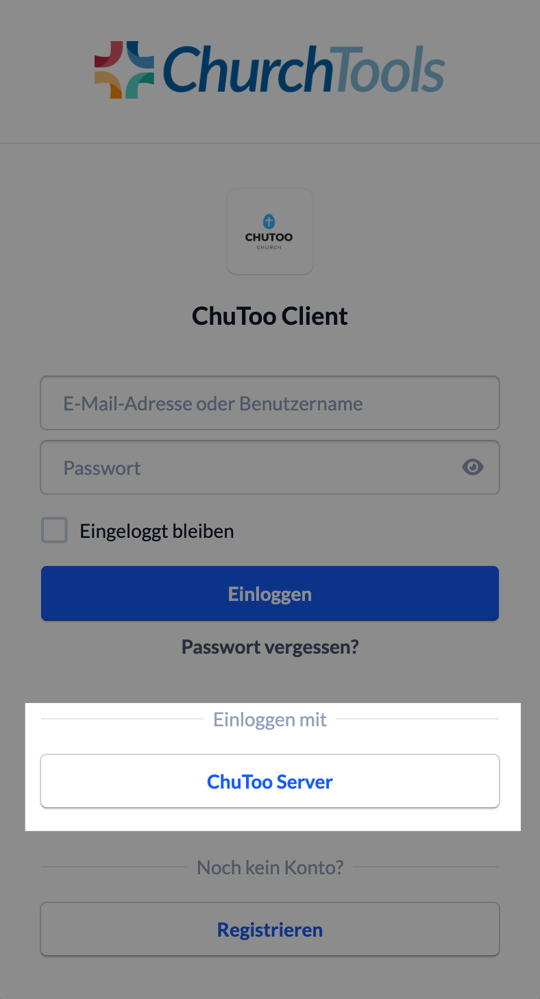In der Login-Maske des Clients wird jetzt die Option eingeblendet, sich über den Authentifizierungsserver einzuloggen. Eventuell ist der Standard-Login für ChurchTools ausgeblendet und damit nicht mehr zu sehen.
