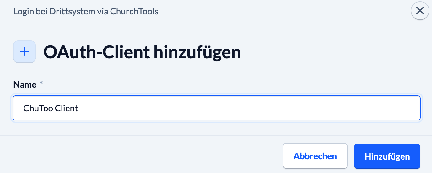Klicke auf die Schaltfläche OAuth-Client hinzufügen. Es öffnet sich ein Fenster, in dem du dem Client einen Namen geben musst. Du kannst den Namen frei wählen, er dient nur zur eindeutigen Kennung auf dem Server. In unserem Beispiel heißt er „ChuToo Client“.