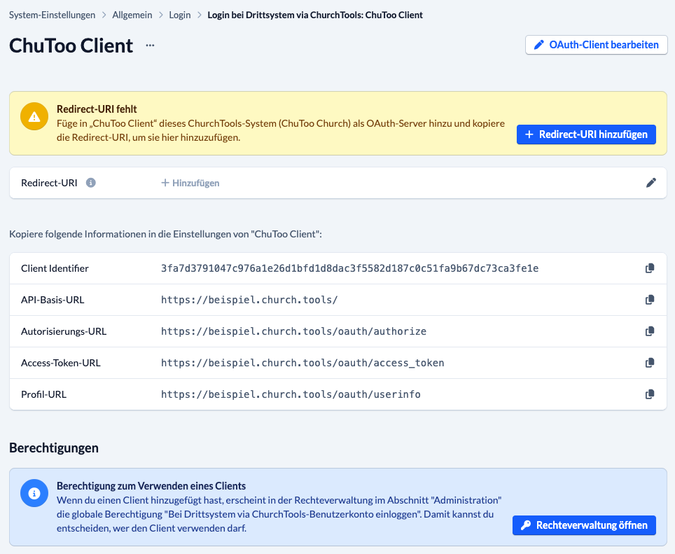 Damit sich Benutzer deines ChurchTools-Servers beim ChurchTools-Clients via OAuth einloggen können, benötigen sie die Berechtigung Bei Drittsystem via ChurchTools Benutzerkonto einloggen (Login to External System). Du findest diese Berechtigung in der Rechteverwaltung im Bereich Administration. Weitere Informationen dazu findest du auf unserer Hilfeseite Login bei und mit ChurchTools.