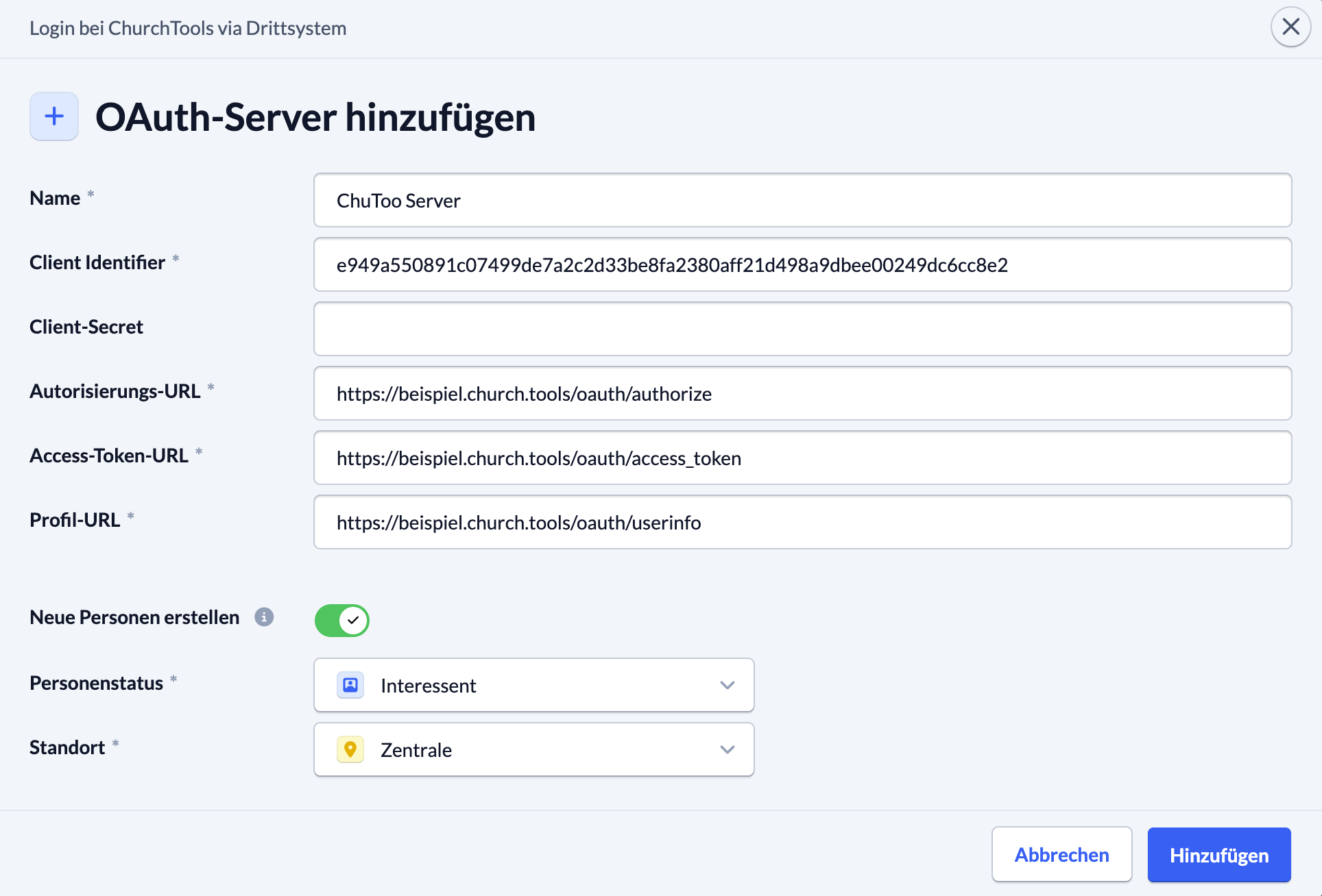 Falls es für deine Verbindung zum Authentifizierungsserver wichtig ist, fülle das Feld Client-Secret aus. Du kannst hier frei ein Passwort vergeben. Für die Verbindung zu einem ChurchTools Server ist aktuell kein Client-Secret notwendig.