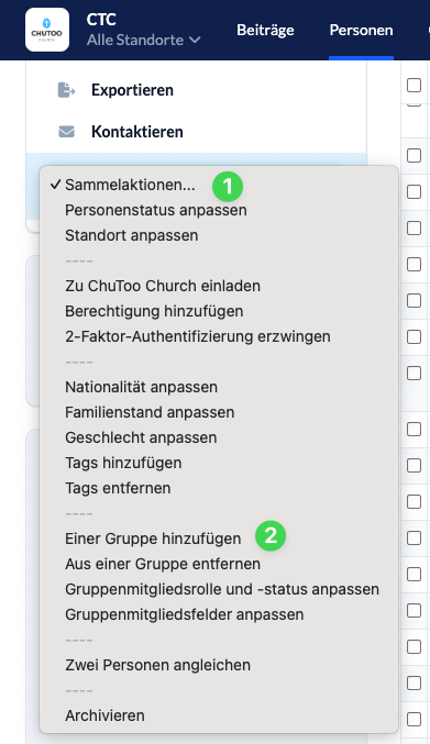 Anschließend wählst du unter Sammelaktionen (1) den Menüpunkt Einer Gruppe hinzufügen (2) aus und folgst den weiteren Schritten.