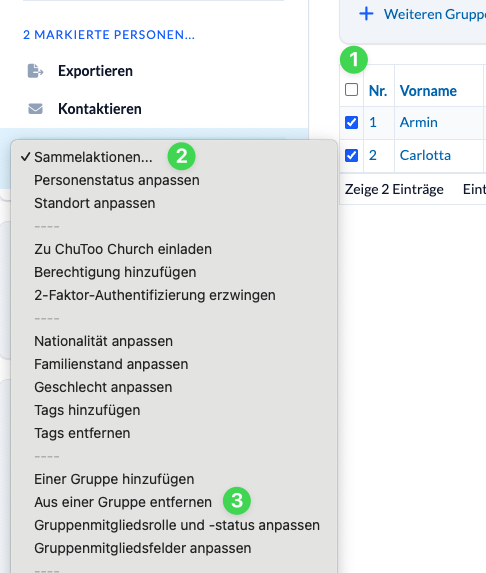 Dort markierst (1) du alle Personen, die du aus der Gruppe entfernen möchtest, wählst in den Sammelaktionen (2) den Menüpunkt Aus einer Gruppe entfernen (3) aus und folgst den weiteren Schritten.