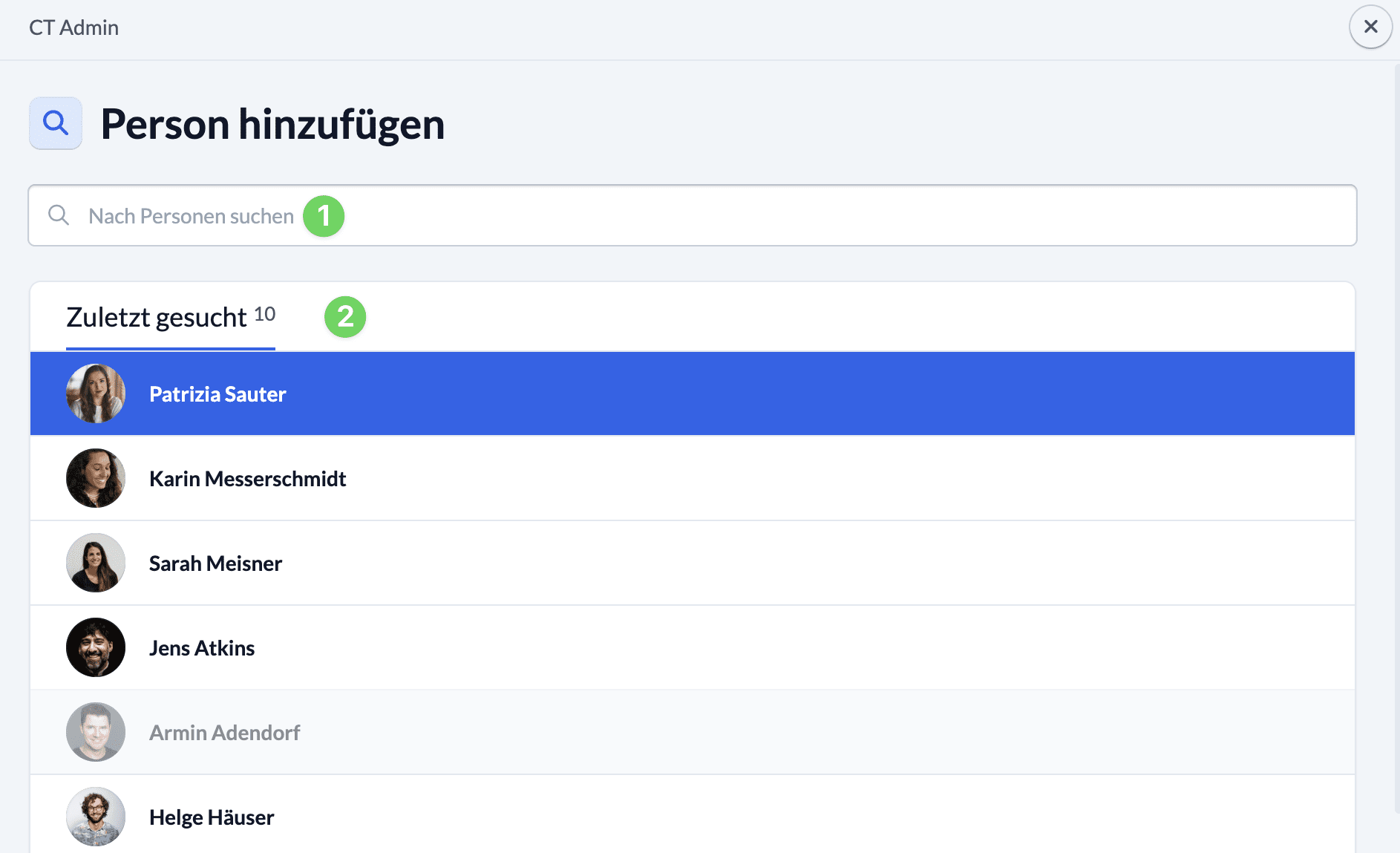 Anschließend kannst du nach der Person suchen (1), die du hinzufügen möchtest oder eine Person aus den Vorschlägen (2) auswählen.