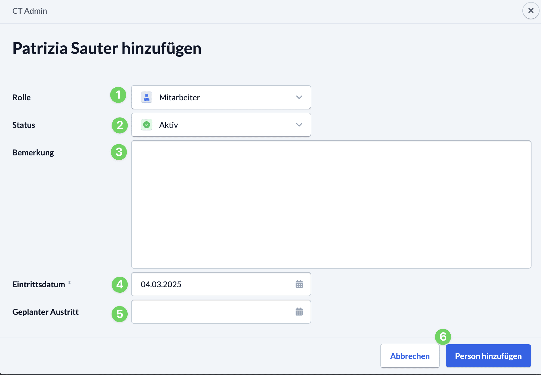 Danach weist du der Person ihre Rolle (1) und ihren Status (2) zu. Du kannst außerdem eine Bemerkung (3) hinzufügen, das Gruppeneintrittsdatum (4) bearbeiten und, falls benötigt, bereits das Austrittsdatum (5) festlegen.