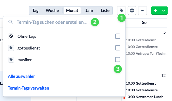 Navigiere in das Kalendermodul und klicke dort in der oberen Menüleiste auf das Tags-Symbol (1). Hier kannst du nun nach einem bestehenden Termin-Tag suchen (2). Mit dem Aktivieren der Checkboxen (3) filterst du deine Anzeige direkt nach Terminen mit den ausgewählten Termin-Tags.