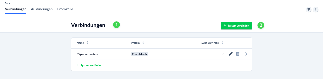 Hier bekommst du einen Überblick über die bereits erstellten Verbindungen (1) und verbindest neue externe Systeme (2) mit deinem ChurchTools.