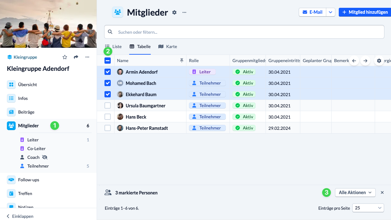 Möchtest du Personendaten bearbeiten, markierst (2) du die Personen, die du bearbeiten möchtest, in der Liste der Mitglieder (1) und wählst anschließend eine Sammelaktion (3) unter der Liste aus.