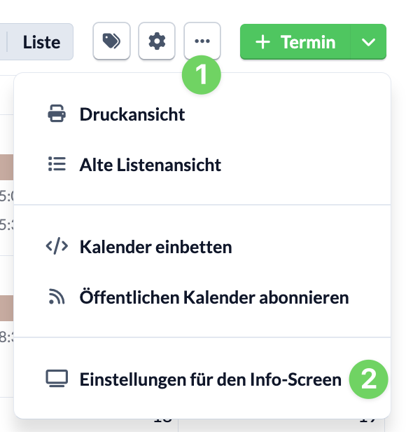 Um den Info-Screen zu erstellen, navigierst du über das Kontextmenü (1) des Kalenders neben dem Zahnrad-Symbol zu den Einstellungen für den Info-Screen (2). Mit diesen Einstellungen generierst du eine URL, über die der Info-Screen aufgerufen werden kann.