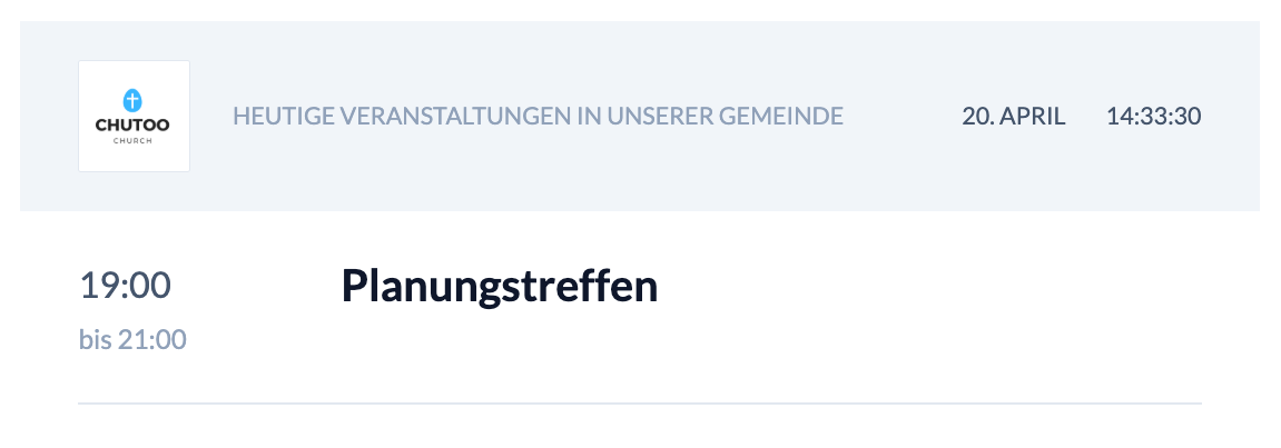 Das eröffnet dir verschiedene Anwendungsmöglichkeiten, wie z. B. eine Terminübersicht für Teilnehmer einer Konferenz zum Abruf auf dem Smartphone oder eine allgemeine Übersicht der anstehenden Termine in der Gemeinde für eine Anzeige im Foyer.