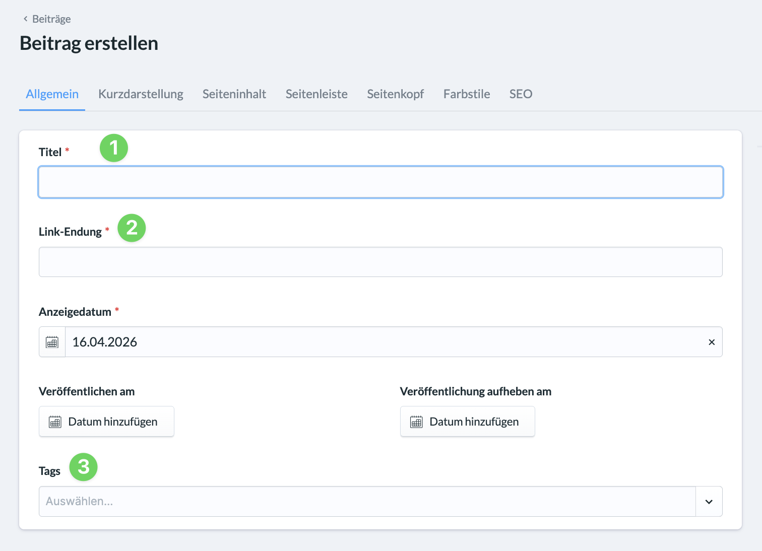 Das, was du unter Link-Endung (2) eingibst, ist später der Teil, der in der URL des Inhalts angezeigt wird z. B. https://meine-gemeinde.de/inhalt/link-endung.