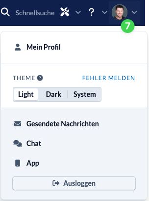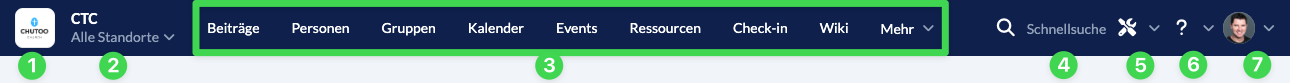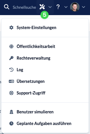 Rechts neben der Schnellsuche findest du das Verwaltungsmenü (5), das Hilfemenü (6) und dein Benutzermenü (7).