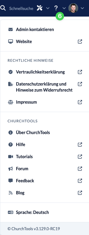 Über dieses Menü kontaktierst du schnell und einfach deinen Admin und findest den Link zu eurer ChurchTools Website, wenn ihr eine gebucht habt.
