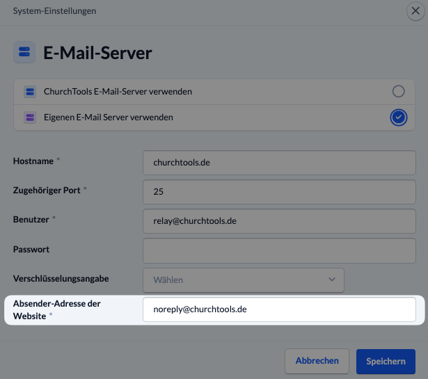 Hier trägst du deine Server-Daten ein und wählst die Verschlüsselung aus. Unter Absender-Adresse der Website trägst du ein, von welcher Adresse die E-Mails aus ChurchTools versendet werden sollen.