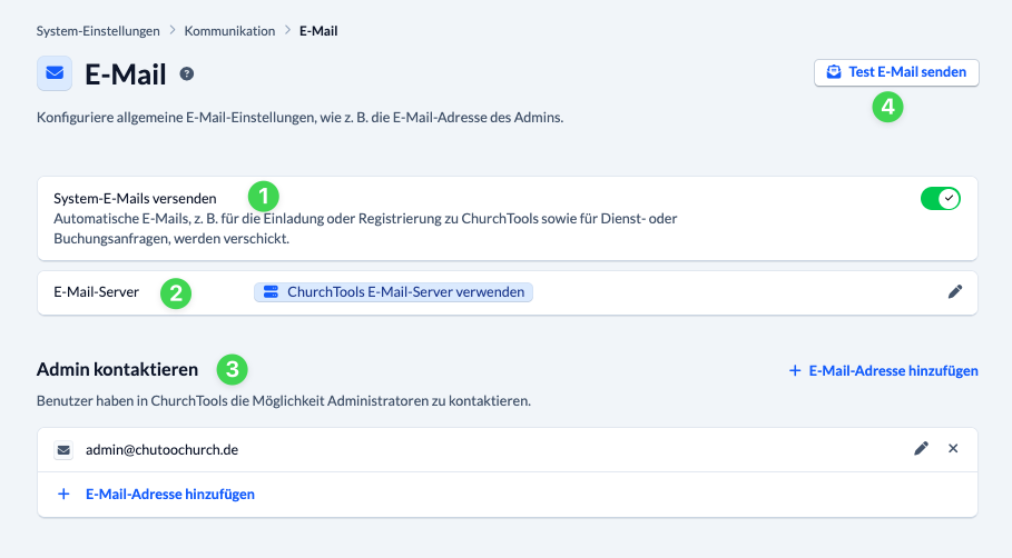 In den System-Einstellungen unter Kommunikation und E-Mail konfigurierst du allgemeine E-Mail-Einstellungen, wie z. B. die E-Mail-Adresse des Admins eures ChurchTools.