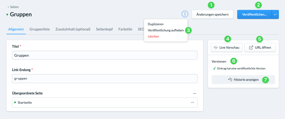 Hier siehst du auf einen Blick, ob eine Seite oder ein Inhalt bereits veröffentlich wurde oder nicht und ob deine aktuelle Seite/dein aktueller Inhalt nicht gespeicherte Änderungen enthält.