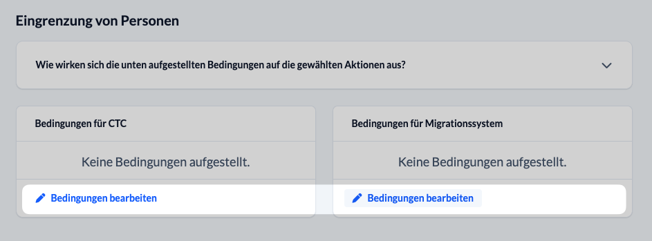 Im Auftrag filterst du über die Button Bedingungen bearbeiten deine Datenauswahl für den aktuellen Auftrag für beide Systeme getrennt, indem du Bedingungen für die Auswahl der Daten aufstellst.