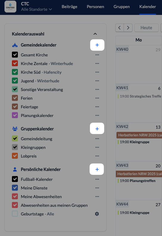 Klicke auf das „+“-Symbol neben der Kategorie, in der du einen Kalender erstellen möchtest.