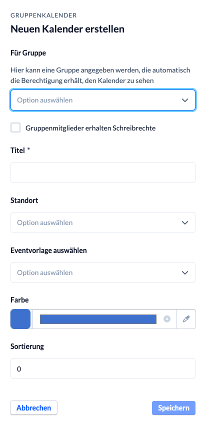 Du kannst eine Gruppe auswählen, mit welcher der Kalender verlinkt wird und bestimmen, ob die Gruppenteilnehmer Schreibrechte für diesen Kalender erhalten sollen. Wie bei den Gemeindekalendern kannst du auch hier einen Standort auswählen und eine Eventvorlage hinterlegen.