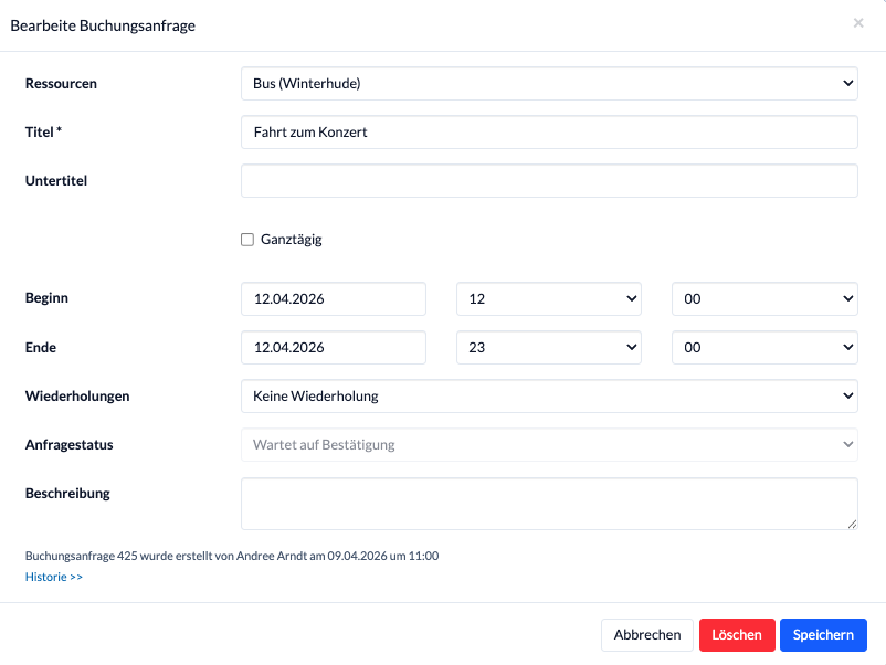 - Der Anfragestatus informiert dich darüber, ob deine Buchung direkt bestätigt ist oder zunächst auf die Bestätigung eines Verantwortlichen wartet.