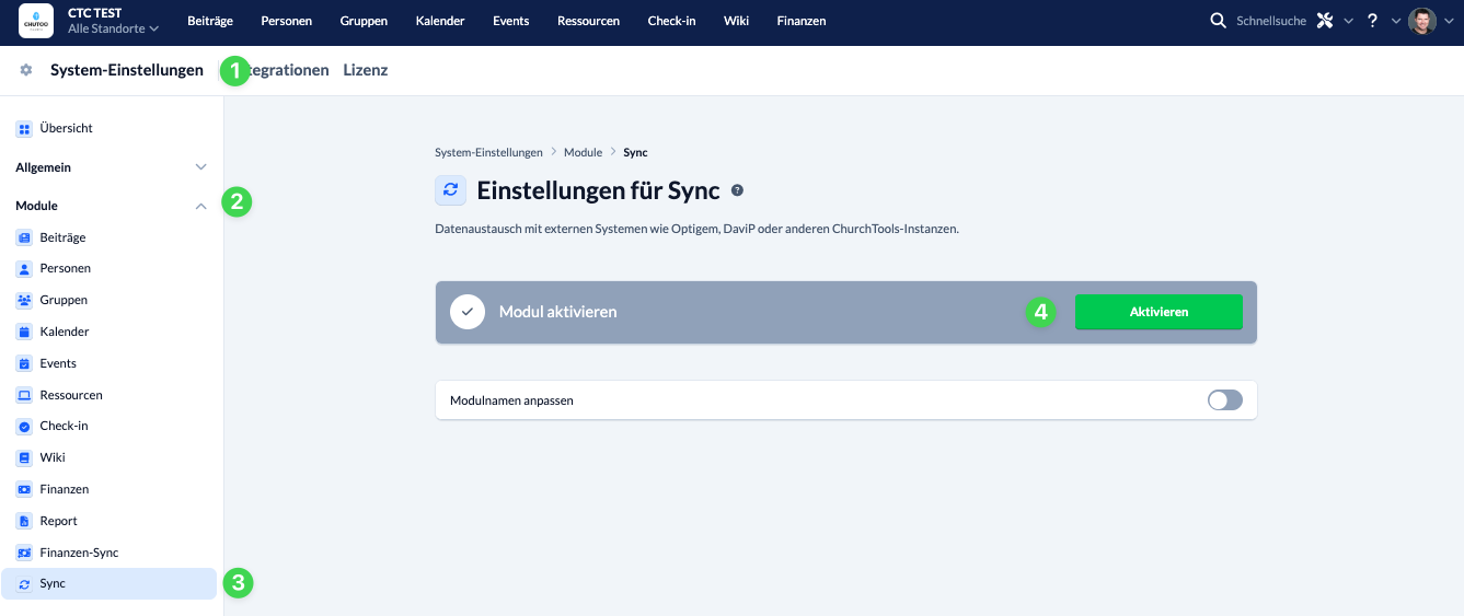 In den System-Einstellungen (1) rufst du unter Module (2) den Sync (3) auf und klickst hier auf den grünen Button Aktivieren (4). Danach kannst du das Modul oben in der Menüleiste aufrufen.