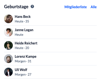 Im Web gelangst du vom Widget aus auch auf die Mitgliederliste, in der dir ebenfalls die Geburtstage angezeigt werden. Welche Personen in dieser Liste angezeigt werden und ob das Geburtsdatum mit oder ohne Geburtsjahr ausgegeben werden soll, kannst du als berechtigter Nutzer direkt in den Einstellungen für die Mitgliederliste festlegen.