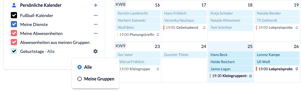 Außerdem kannst du dir im Kalender die Geburtstage anzeigen lassen – entweder alle, die du sehen darfst, oder nur die deiner Gruppen.