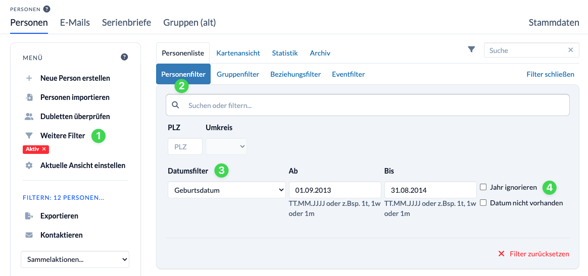 Dazu stehen dir im Personenmodul die Weiteren Filter (1) zur Verfügung. Hier kannst du für genau solche Anwendungsfälle unter Personenfilter (2) den Datumsfilter „Geburtsdatum“ (3) mit und ohne Geburtsjahr (4) verwenden. Den Filter selbst kannst du absolut, also für einen definierten Zeitraum, oder relativ zum aktuellen Zeitpunkt einstellen.