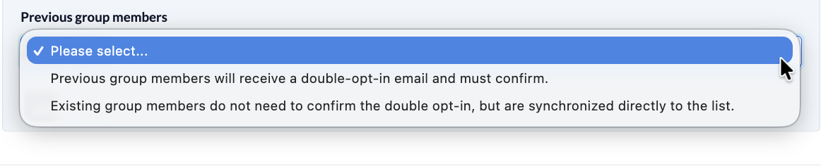Here you can set whether previous group members should also receive an opt-in e-mail or not (e.g. because they have already given their opt-in when switching from one newsletter platform to another).