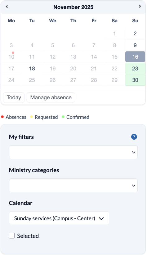 You can also see your absences in the calendar; these are marked with a red dot, your confirmed roles are green and requested roles are yellow.