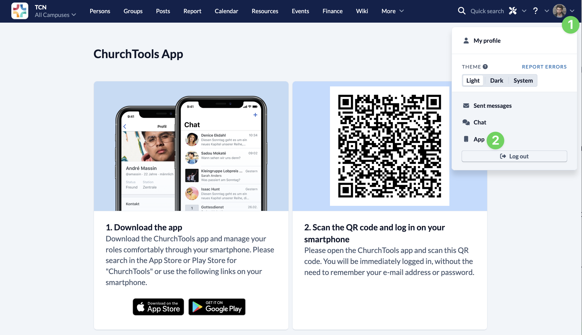 The ChurchTools app is the easiest way to get in touch with other users. The app is available in both the Apple App Store for iOS and the Google Play Store for Android.