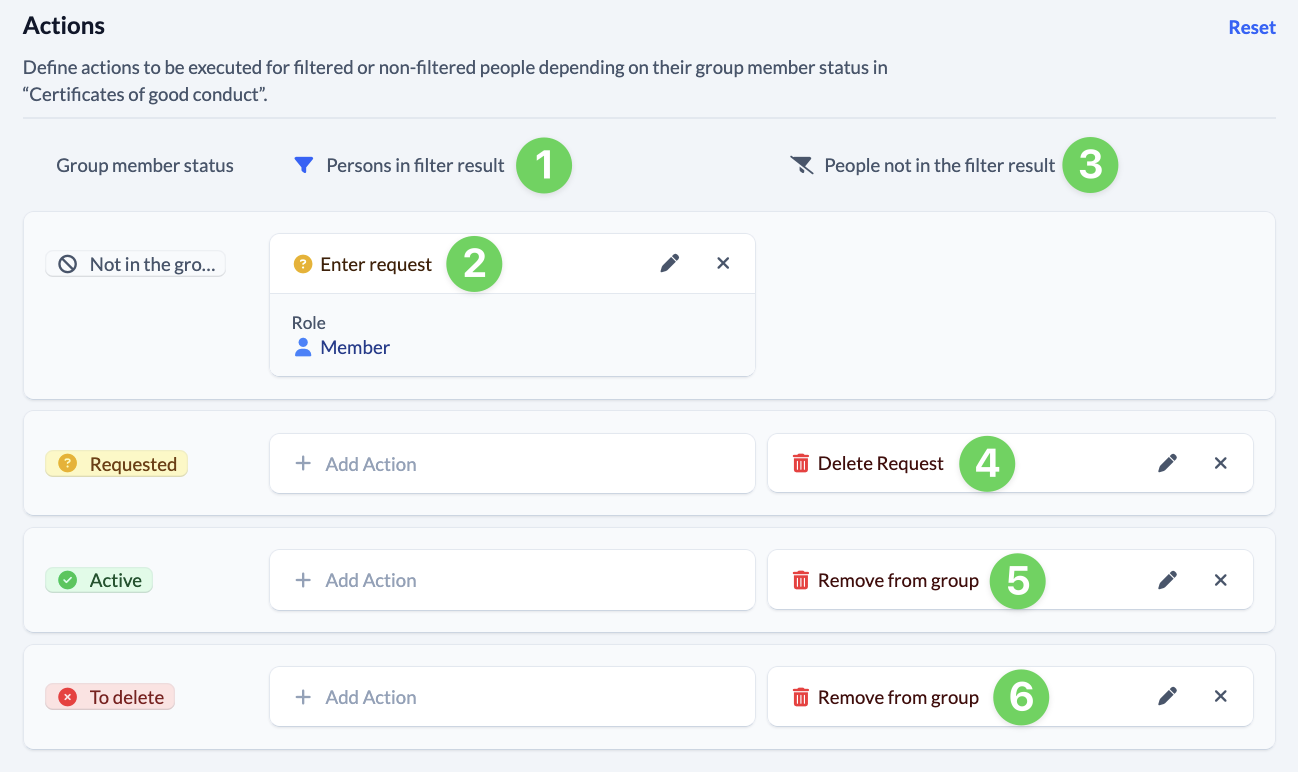 Switch to the Actions section directly below. Under People in the filter result (1), set them to be added to the “Certificates of good conduct” group with the group membership status Requested and the Role “Member” (2).