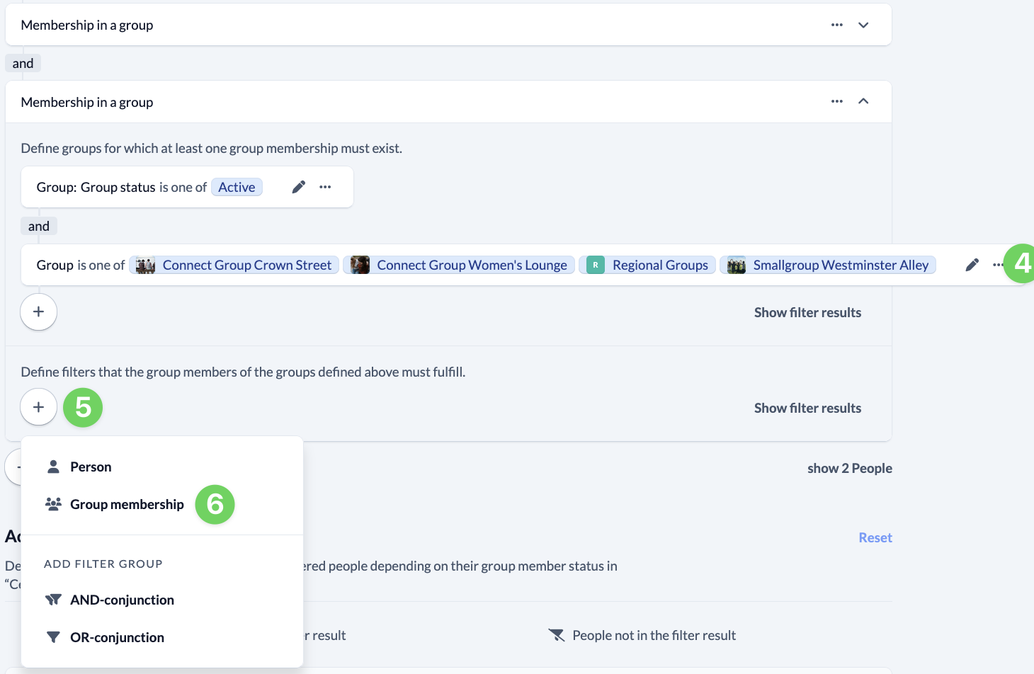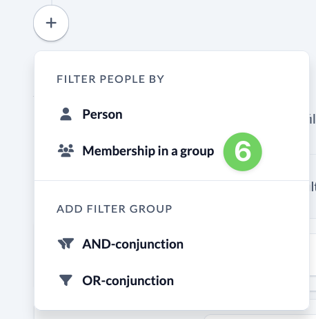 In the People filter section (3), you will first see a filter that filters out all archived and deceased people (4). Simply leave this filter untouched and click on the bottom plus (5).
