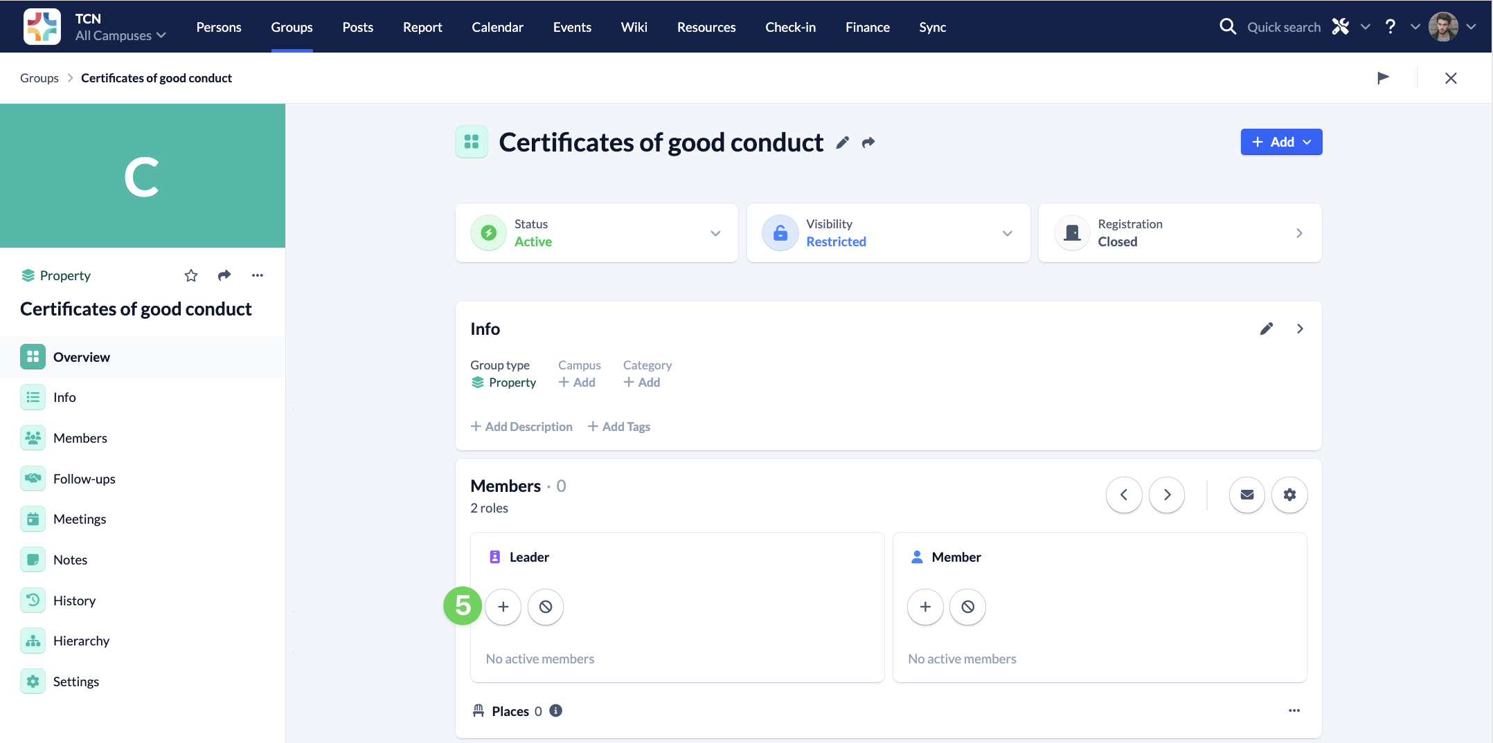 Once the group has been created, find the person or persons responsible for keeping track of the certificates of good conduct using the plus symbol under Leader (5) and add them to the group.