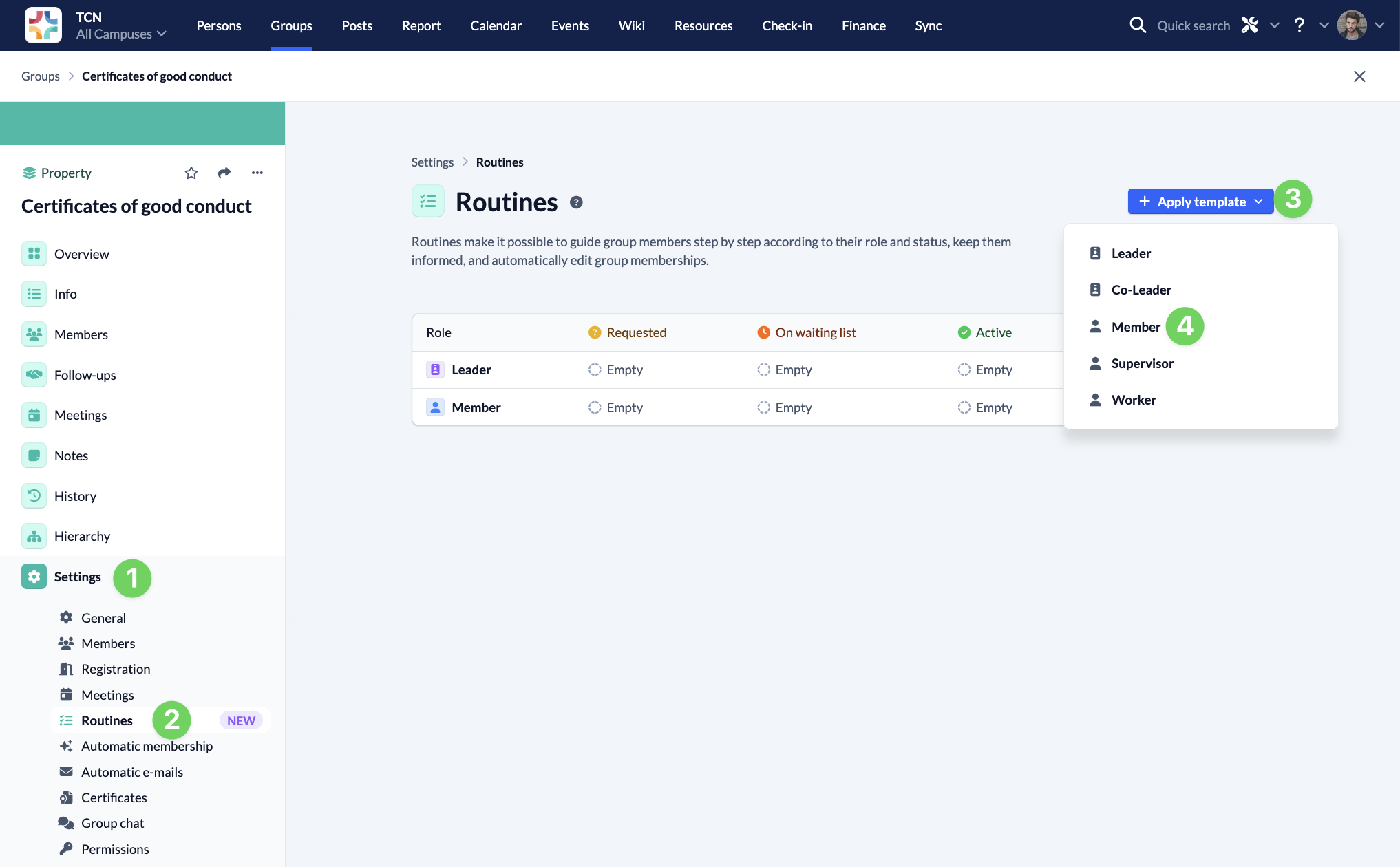 In the group, open the settings (1) for routines (2) at the bottom left of the menu and click on the “Member” (4) Role under Apply template (3).