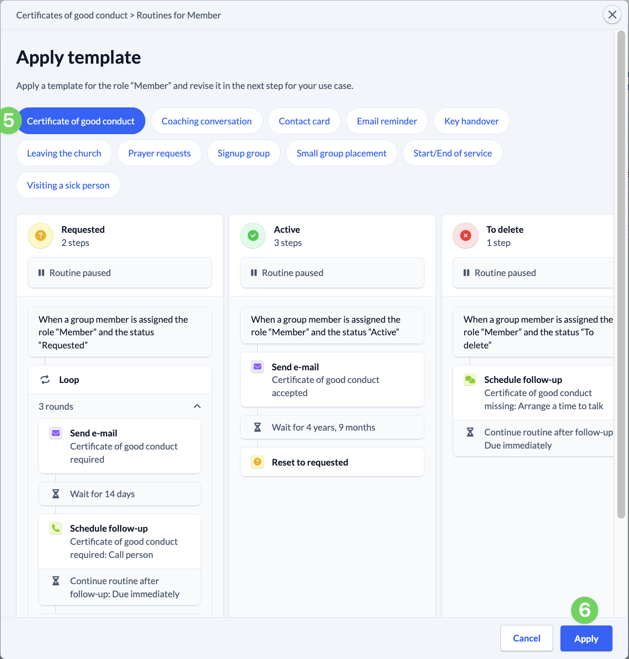 Now select the “Certificate of good conduct” template (5) and click on Apply (6).