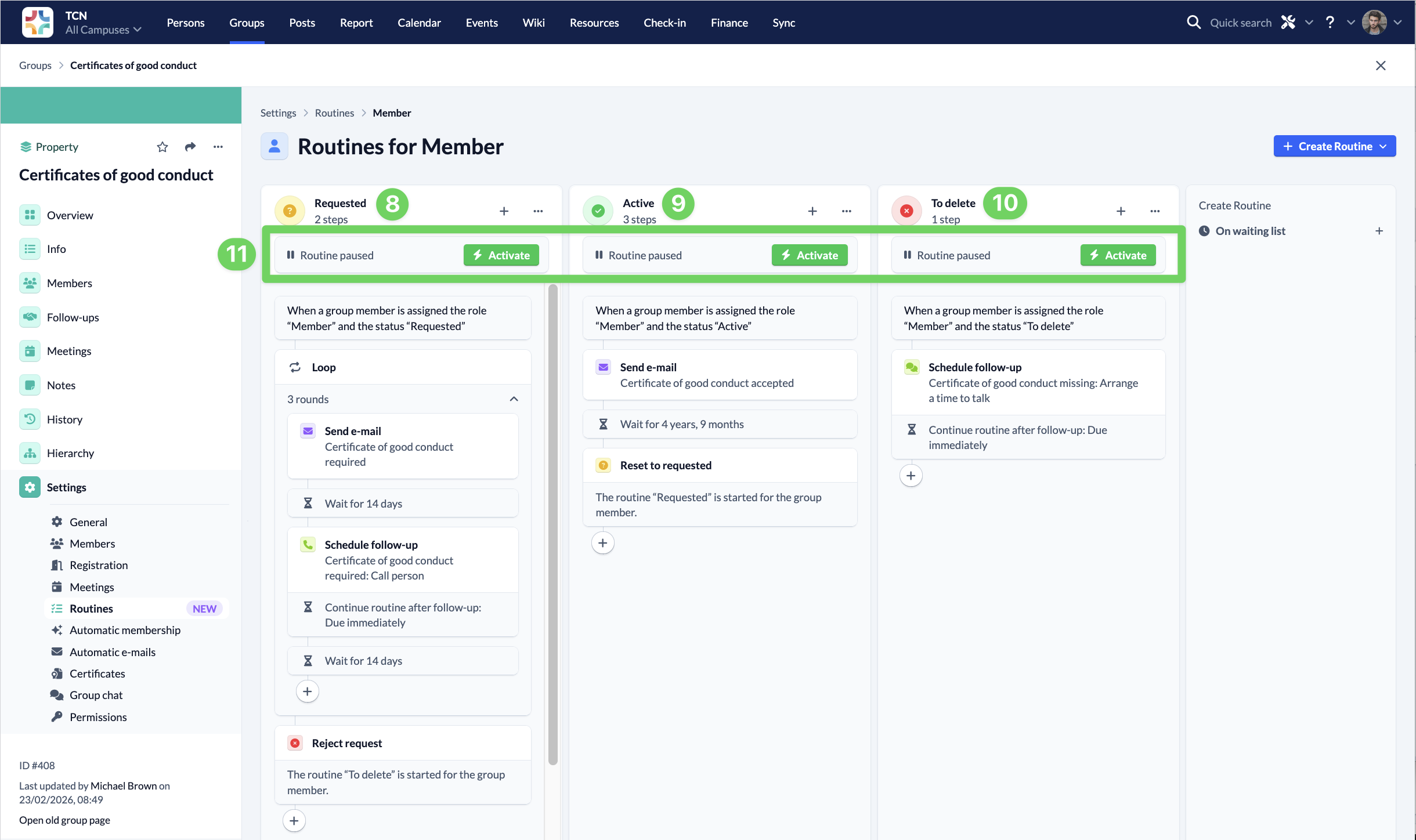 Once you have applied the template, customize the terms and texts of the template for all group membership statuses “Requested” (8), “Active” (9) and “To delete” (10) for you. Finally, activate (11) the routines for each individual group membership status.