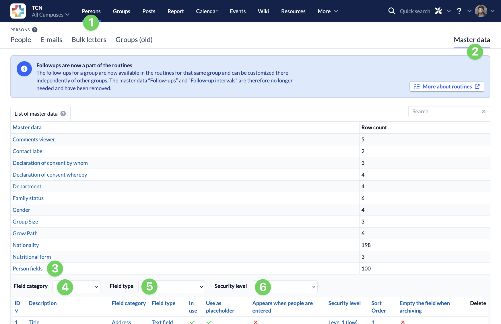All fields that have already been created can be found in the Persons module (1) in the master data (2) under Person fields (3).