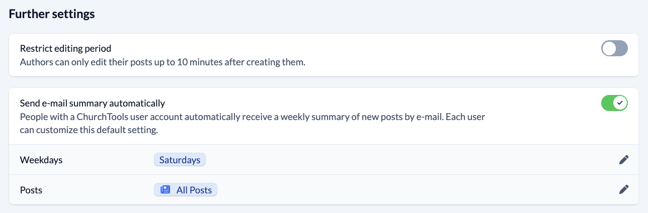 You can set up all users with a ChurchTools account to receive a summary email once or several times a week, informing them about posts from the past few days. You can specify whether they should receive summaries of all posts or only posts from their own or recommended groups.