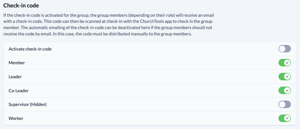 If you want to quickly and easily record the attendance of group members who come to a meeting, you can activate the check-in code function for your Group. This will send an email with the check-in code before a meeting. Below this, you can also specify which role a group member must have in order to receive a code.