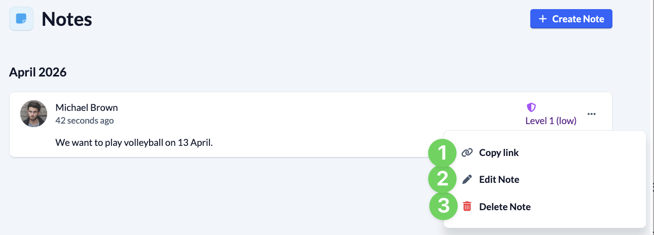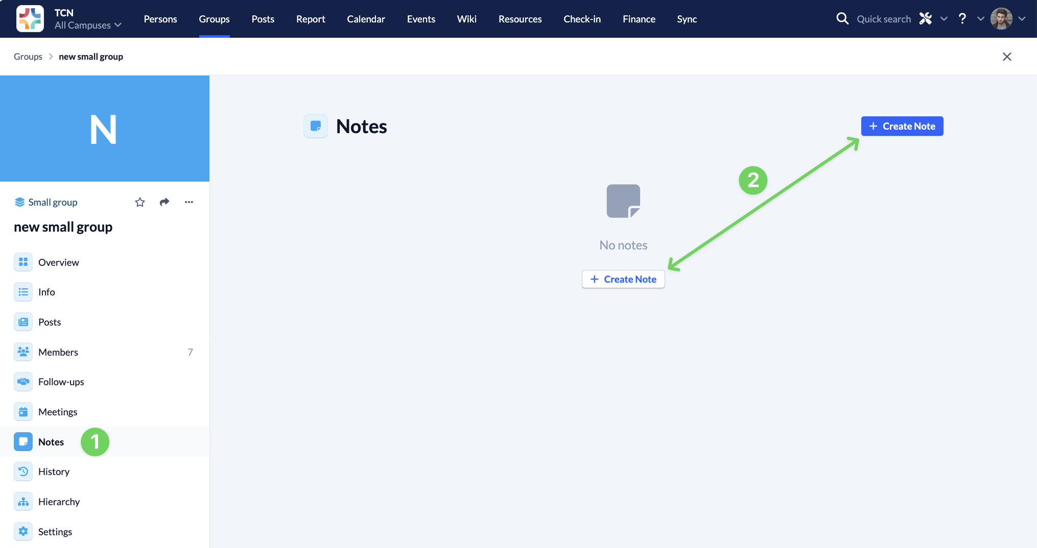 To create a new note, navigate to the Notes section (1) and click on Create Note (2).