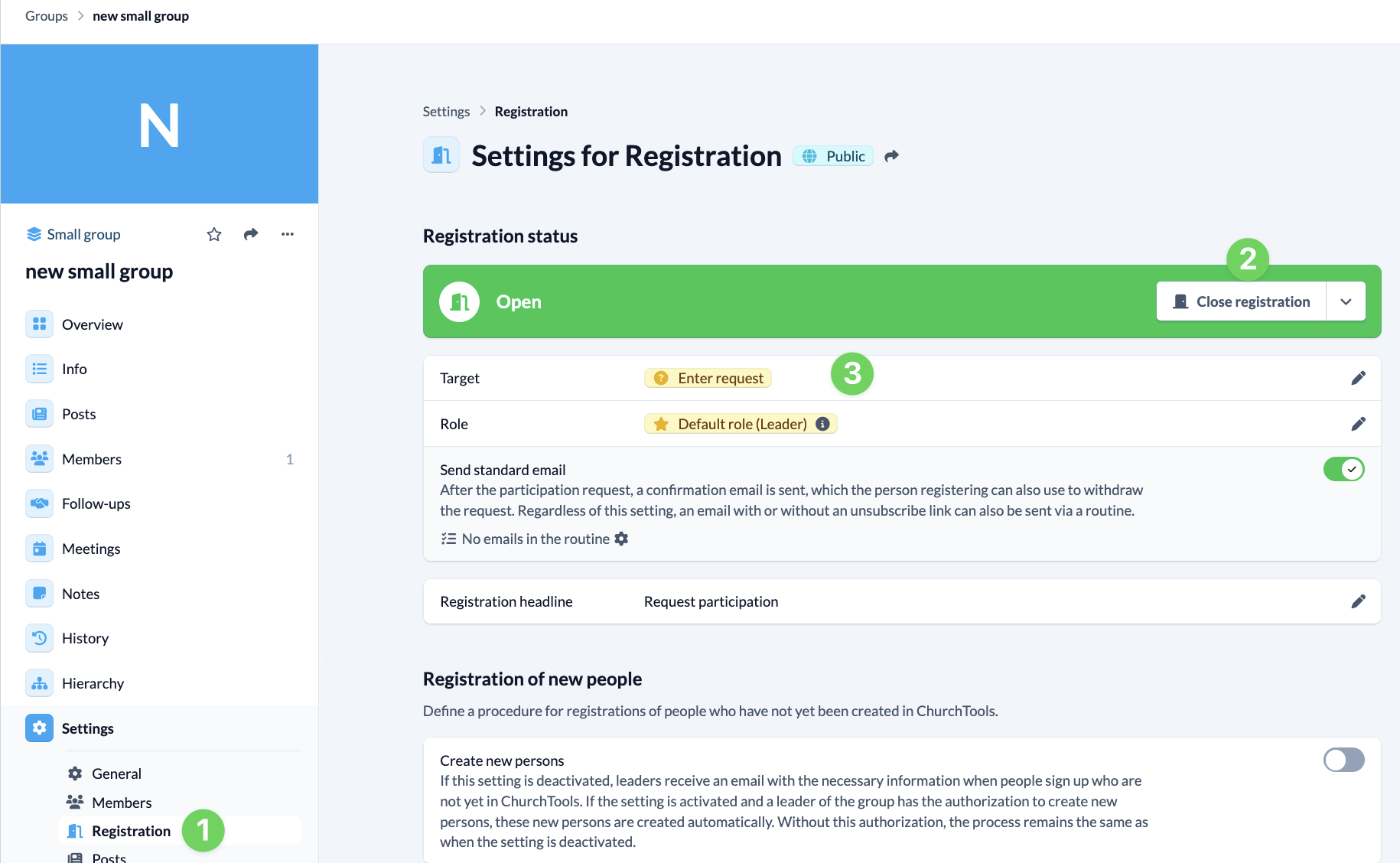 To ensure that anyone who is interested can register with you as a leader, you should complete the registration (1) for your group open (2).