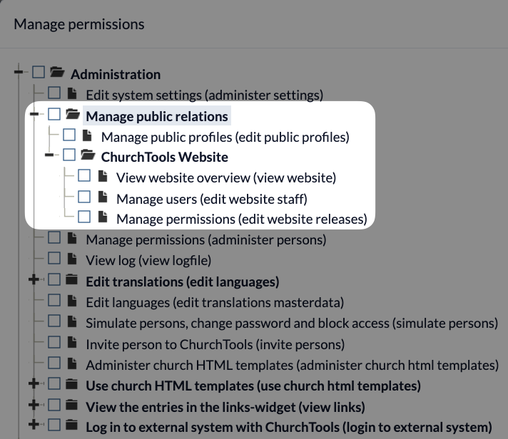 The collective authorization Manage public relations includes the authorization Manage public profiles (edit public profiles) and the collective authorization ChurchTools website with the three permissions View website, Manage users (edit website staff) and Manage releases (edit website releases).