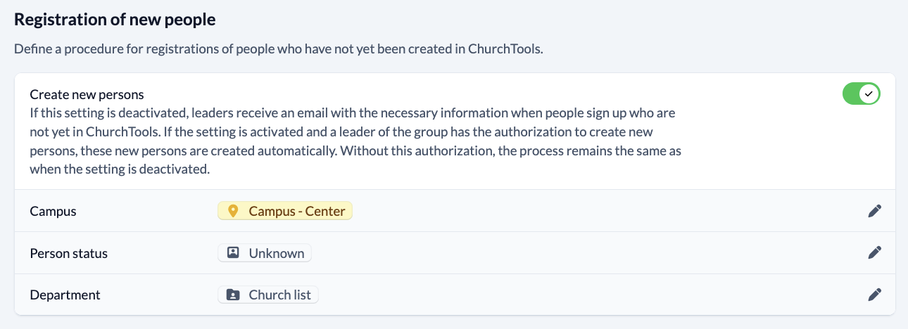 For people who sign up to your group and have not yet been created in ChurchTools, ChurchTools needs to know what to do with the data entered.