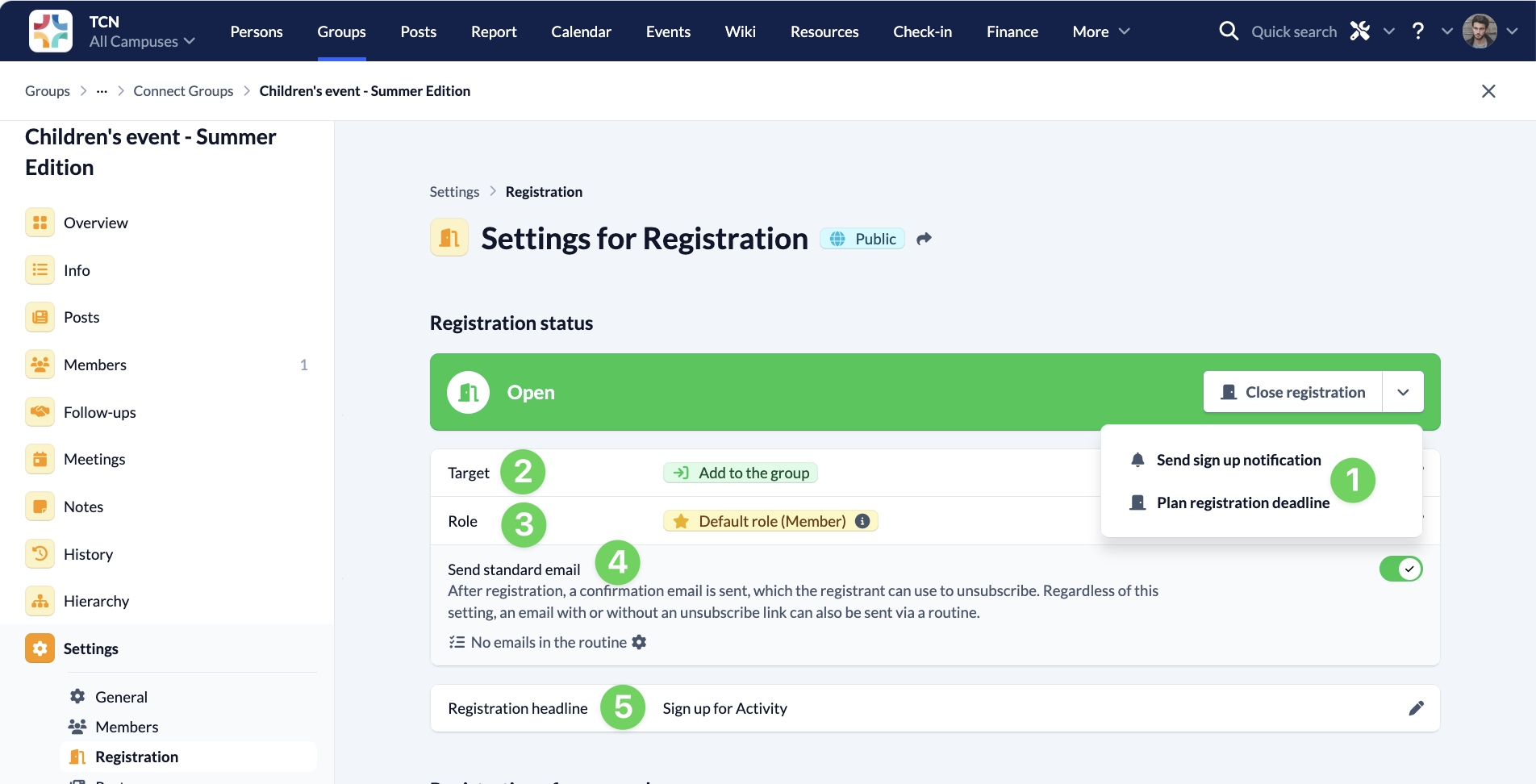 Here you specify when the registration should be opened and closed (1), whether the target (2) of the registration is an immediate release or whether a leader must confirm the participation and which Role (3) the person should receive after successful registration.