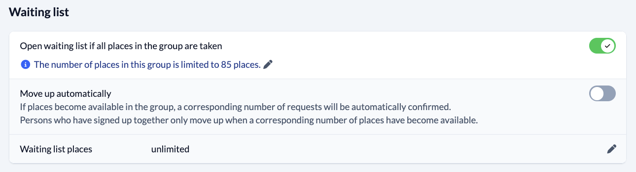 If the places for your group are limited and full, this function automatically adds other people who sign up to your group to a waiting list.