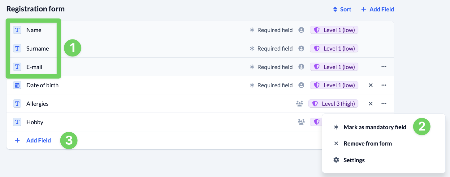 - You can mark each added field as a mandatory field via the context menu (3) at the end of the line or remove it from the form. If it is a selection field, you can also call up further settings for the field here.