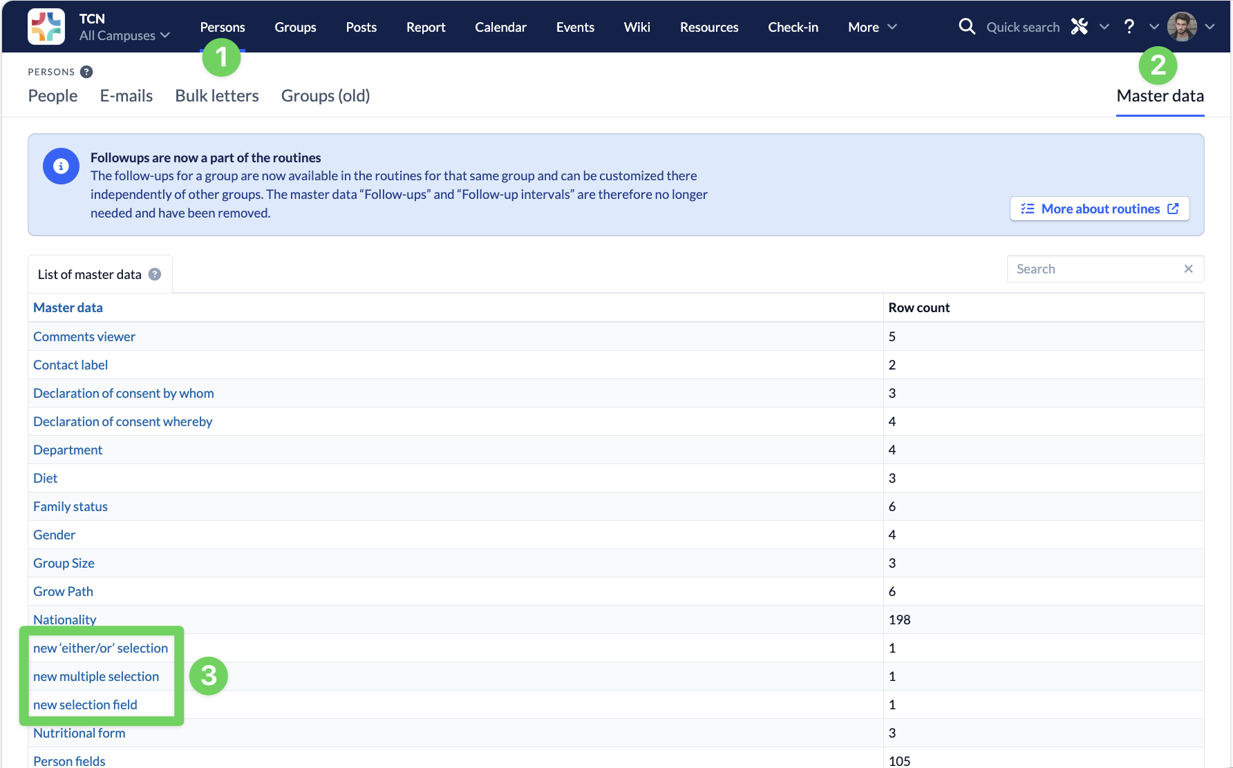 After you have created a selection field, a multiple selection or an either/or selection , these fields are displayed in the People module (1) under Master data (2) sorted alphabetically in the list of master data (3).
