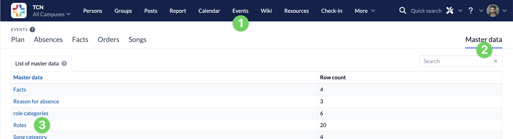 In the Events module (1), call up the master data (2) on the right-hand side and select the Roles (3) here.