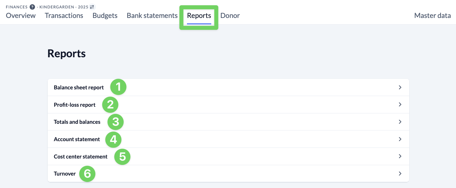 ChurchTools Finance offers you six different reports (financial reports) so that you can view clear information about your church’s finances.
