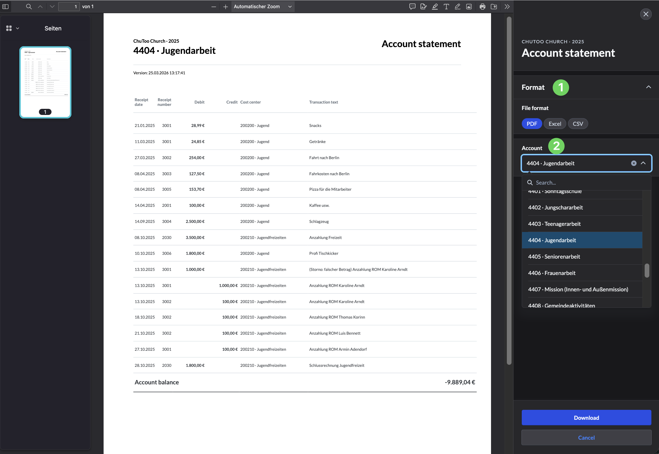 In the menu on the right-hand side, select the file format (1) and the account (2) for which you want the account statement to be displayed.